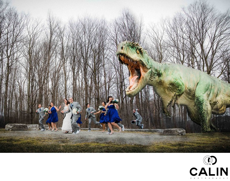 This is one of the first special events I documented as a full-time professional wedding photographer and it will always be close to my heart. Having worked with Ramiro in the past, I have a special relationship with the bride and groom and we did our absolute best to make sure the couple was happy with their photos. Prior to the big day, Marcella handed me a shot list she wanted accomplished. One of the beautiful bride's requests was especially challenging as it required photo shopping a dinosaur chasing the bridal party. When the couple told me about the picture I had no idea how it could be done, but I have seen similar creations in the past. As such I did a lot of research and on the great day I was ready! This photograph opens the wedding album you're about to see.