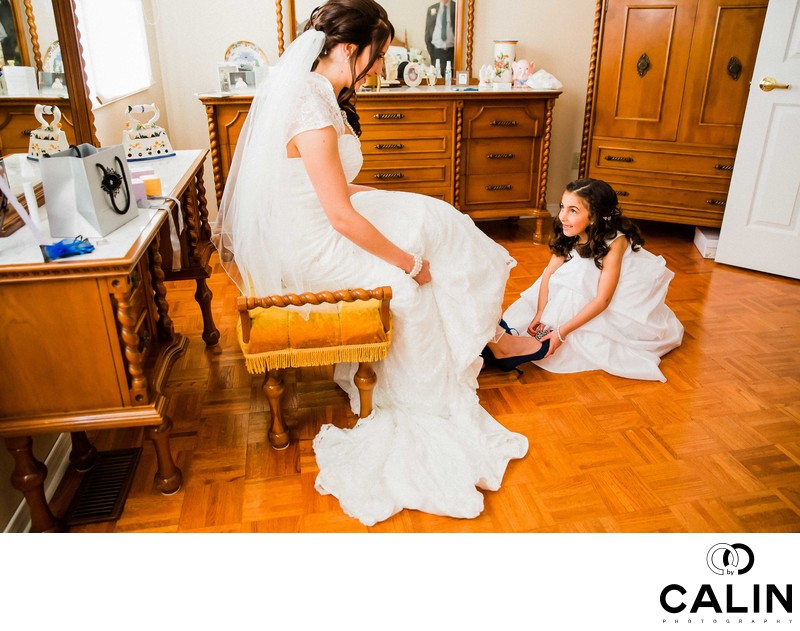 On a fairly cold April day both wedding photographers started documenting the groom preparation. The five groomsmen were very energetic and a pleasure to deal with. The cutest of the guys was a little ring bearer was beautiful bride's nephew. The photo shoot went smoothly Dr. while we moved to the bride's house For the bridal party and the guests were getting ready for the big day. In every culture getting married is crucial milestone in someone's life but for Italians this is of THE most important day ever. As such, the brides parents house was adorned with many bows and everyone was enjoying the big day. We started photographing Marcella's preparation for her wedding ceremony in the brides room on the second floor of her beautiful house. A touching moment to place when the flower girl helped the bride put on her shoes. In my whole career as wedding photographer I have rarely seen such a beautiful scene.