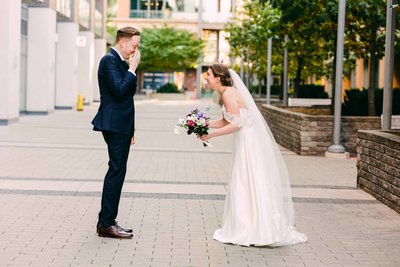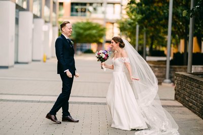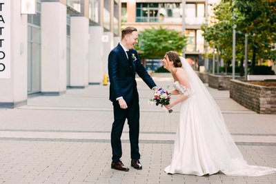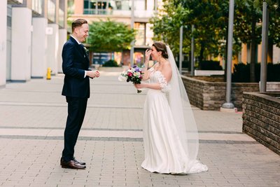 The most convenient spot that comes to mind is in right front of the massive windows. Paul Garfinkel Park is also a great option, though you will need to budget extra time as these places are crowded. During our consultations with our couples, we discuss other options for the first look, spots located in a 10 minute radius from the venue.